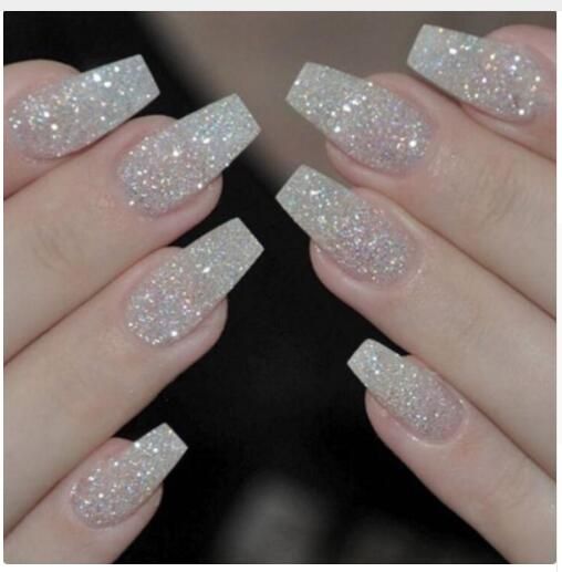 Shimmer Glitter Artificial Nails Nude Color Medium Square Fake Press