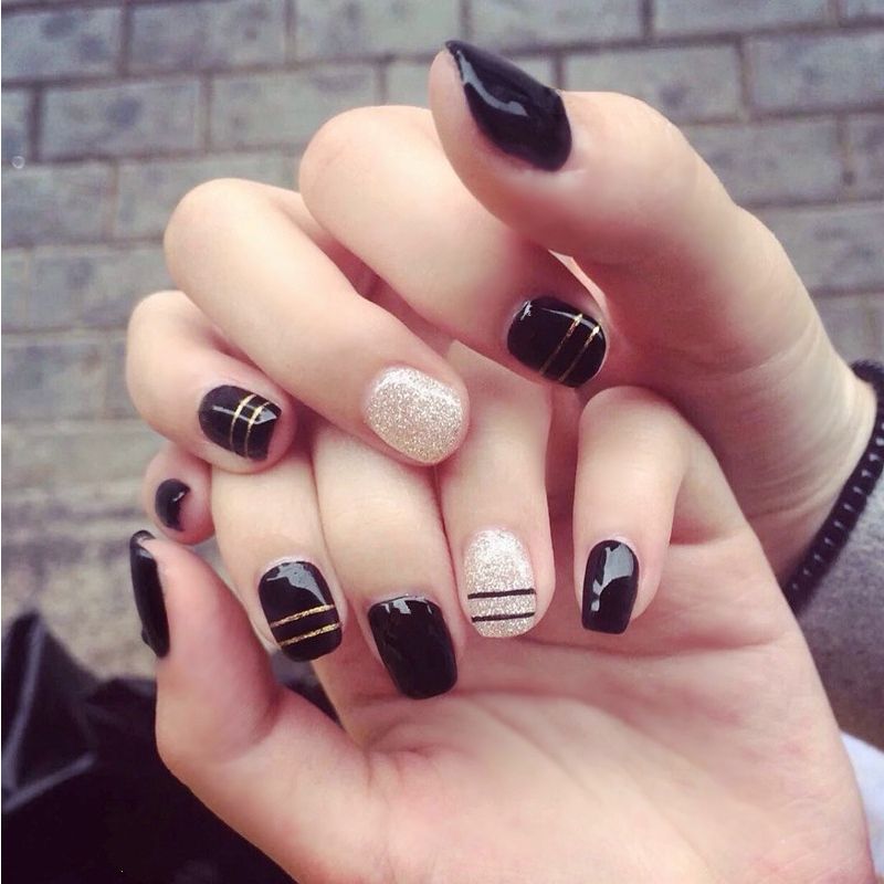 Fashion Black Silver Glitter False Nails Pre Designed Double Line
