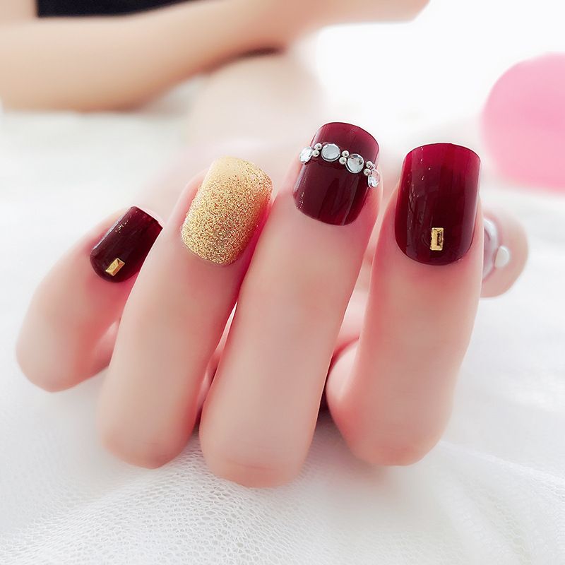 Fashion Wine Red Silver Glitter False Nails Pre Design Rhinestone