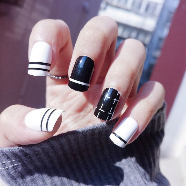 Short Fake Nails Black White Flat False Nail Tips Stripe Dotted Line