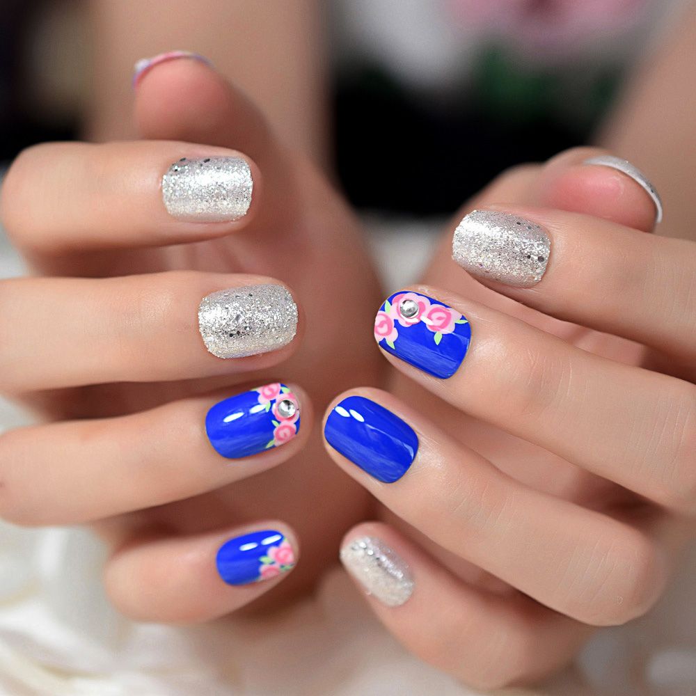 Acquista Uv Blu Rosa Rosa Francese Unghie Finte Scintillante Argento