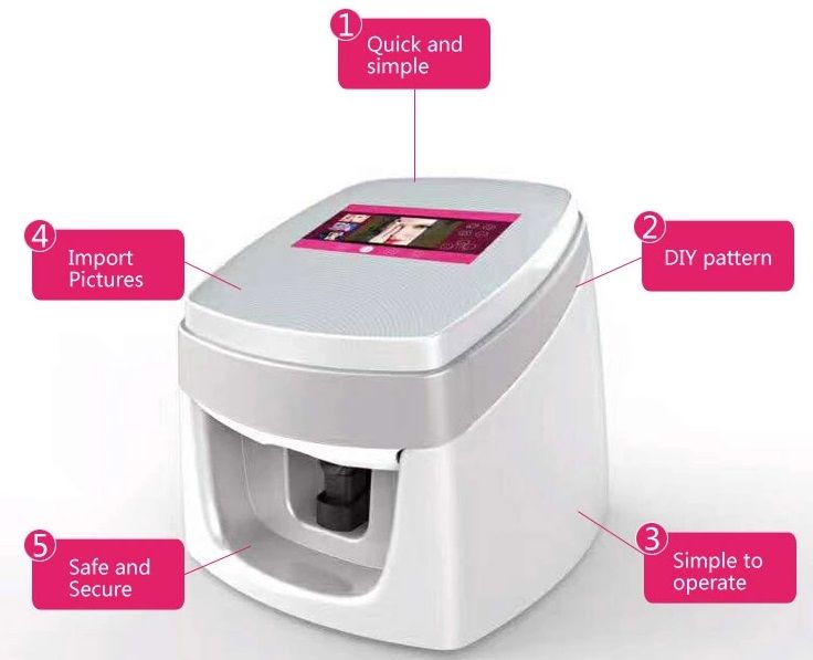 Intelligent detection of the distance between the nail surface and print head. O2nails is a global nail printer manufacturer with 16 years experiencewhose products are sold to more than 80 countriesowns dozens of invention and utility model patents in the field and passed the national high tech enterprise certification and iso9001 certification. User can print hisher own hisher lovers or relatives head portrait on hisher nails.