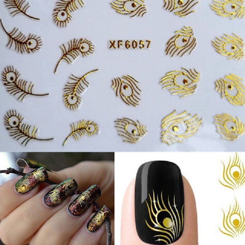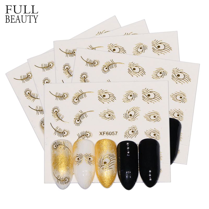 Full Beauty Nail Art 3d Sticker Gold Peacock Feather Adhesive Decal