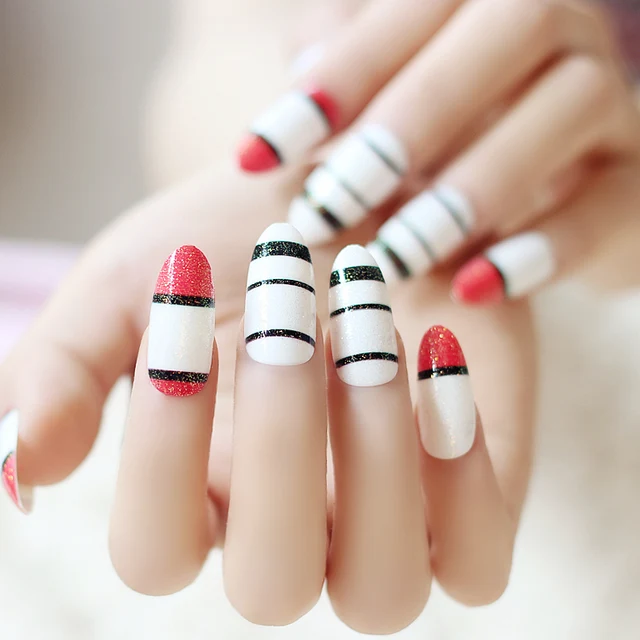 Pre Glued Nails Nail Art 24 Pcs False Nail With Black Red White