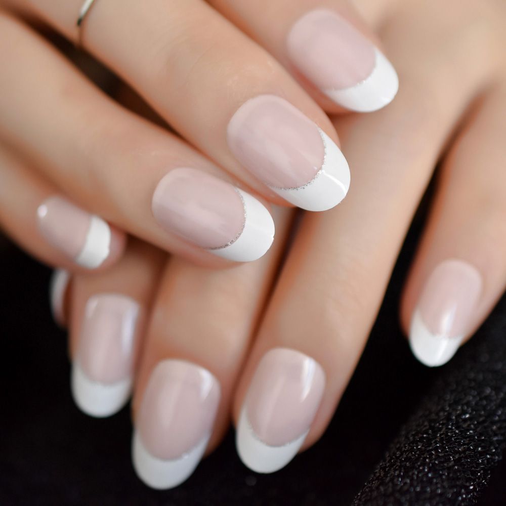 Elegent Nail Art Tips Oval Medium White French Nail With Silver