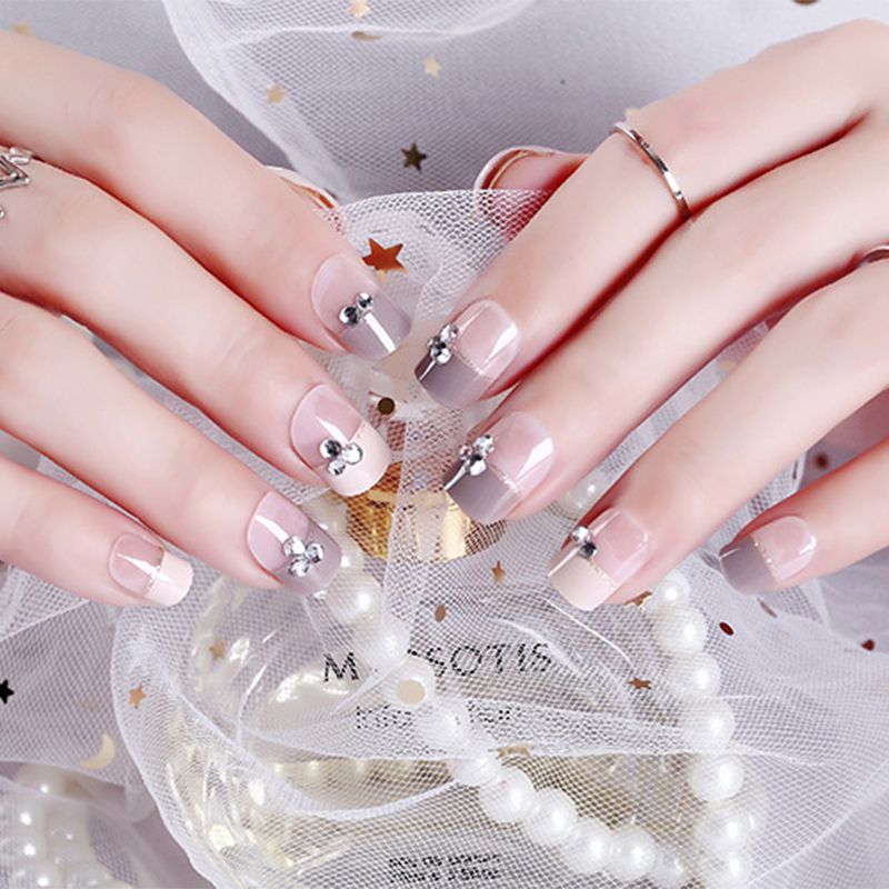 Short French False Nails Pre Design Handmade Light Grey Rhinestone